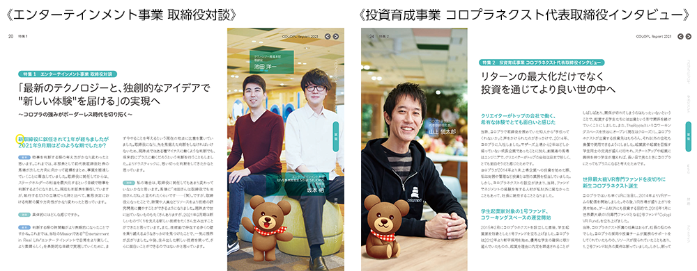 「COLOPL Report 2021」は、当社グループが中長期的に企業価値を向上していくための戦略や方針、取り組みを「価値創造プロセス」として体系的にまとめています。また、新体制移行後の経営陣のインタビューや対談、ESGやSDGsへの取り組みなど当レポートでしか見ることができない内容を多く掲載しています。