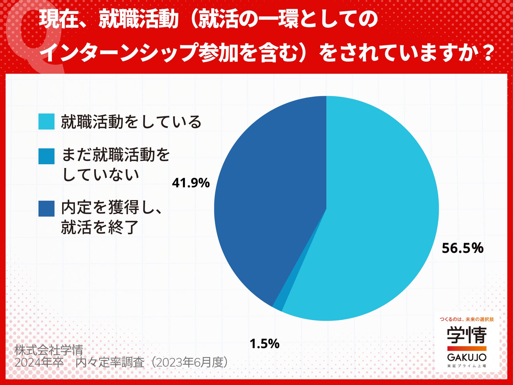就職活動をしている学生は、「56.5%」まで下落。4月末時点から1ヵ月で15.5ポイント減と、大きく落ち込みました。“内定(内々定)を獲得し、就活を終了”した学生は「41.9%」と4割を超しています。