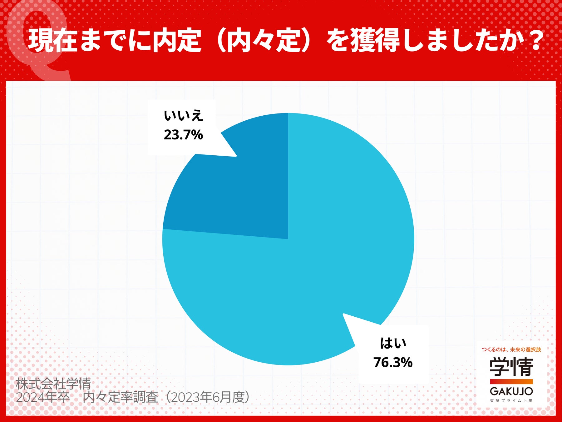 2024年卒学生の5月末時点の内々定率は<76.3%>。4月末時点から1ヵ月で12.0ポイント上昇。約4割の学生が「内定(内々定)を獲得し、就活を終了」と回答。