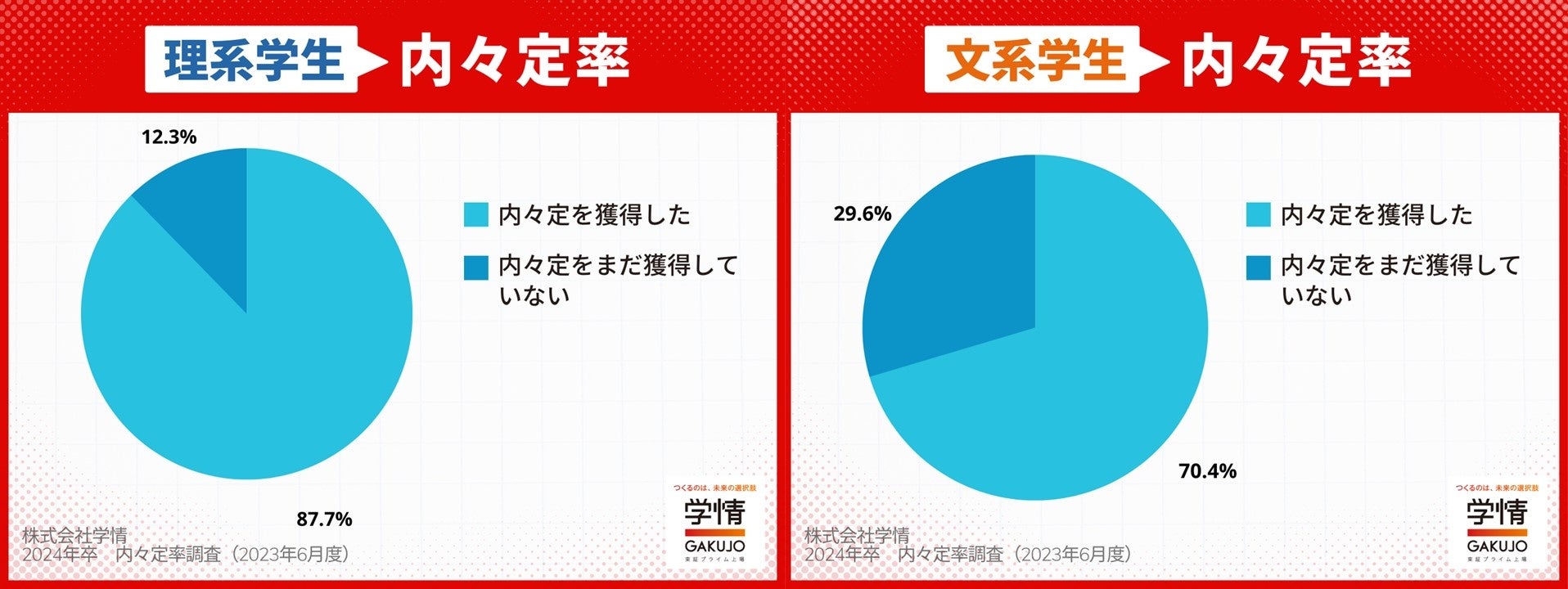 文理別では、理系が「87.7%」(前年同時期比+9.6ポイント)、文系が「70.4%」(同+7.8ポイント)と、ともに前年同時期を上回りました。理系の内々定率は9割に迫っており、前年の6月末調査時の「86.9%」をすでに上回っています。
