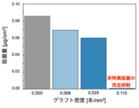 また、生体膜を構成するリン脂質に特徴的な双性イオン(両性イオン)(注4)構造の「ホスホリルコリン基」を有するモノマーのATRPにより、鎖の長さが制御された高分子鎖を導入したコア-シェル型のラテックス粒子を合成しました(図2)。この結果、ATRP開始基から高効率でグラフト鎖が成長し、グラフト密度はσ = 0.008 ~ 0.11 本/nm2となりました。このコア-シェル型のラテックス粒子を、緩衝液中でタンパク質の一種であるウシ血清アルブミン(Bovine Serum Albumin:BSA)と混合し、BSAの吸着量を測定したところ、コア粒子(σ = 0.000 本/nm2)およびグラフト密度の低い(σ = 0.008、0.025 本/nm2)コア-シェル型のラテックス粒子ではある程度BSAが吸着してしまいましたが、グラフト密度の高い(σ = 0.11 本/nm2)コア-シェル型のラテックス粒子では、BSAの非特異吸着は完全に抑制されていることが明らかになりました(図3)。