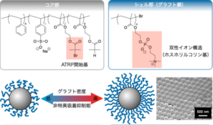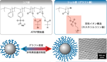 研究チームはこれまで、高分子微粒子合成法に原子移動ラジカル重合(Atom Transfer Radical Polymerization:ATRP)(注3)という高分子合成の手法を組み合わせることにより、親水性の高分子鎖が導入されたラテックス粒子表面へのタンパク質の非特異吸着が抑制されることを報告していました(参考文献1-4)。しかしながら、IVDの精度および信頼性の向上には、主に疎水性による、タンパク質の非特異吸着のさらなる抑制が求められていました。そのためには、タンパク質が吸着しにくい「非汚損性(アンチファウリング特性)」に優れたラテックス粒子の表面構造の設計が必要でした。