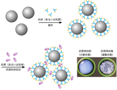 COVID-19、インフルエンザ、ノロウイルスなどのウイルス感染症への対応では、感染原因であるウイルスを特定し、急性期・回復期・既感染などの病状の各段階に応じた適切な治療方針を決定することが必要です。また、癌などの病気を早期に発見し、進行度や治療効果を正確に判定することは、生存率の向上につながります。現在までに、身体への負担が少なく、簡便性、迅速性、定量評価、コスト効率などに優れた様々なタイプのIVDが開発されています。IVDのなかでも、ラテックス粒子を利用した血液や尿などに含まれる特定のタンパク質を定量的に測定する「免疫比濁法」は、予防・診断・治療・予後管理の全ての段階を支える診断ツールとして広く利用されています。免疫比濁法では、ラテックス粒子表面に固定化した抗体(または抗原)と、血清などの検体中に含まれる抗原(または抗体)との抗原抗体反応を利用したラテックス粒子同士の特異的な凝集を「濁り度」として計測することにより、検査対象となる物質を定量的に評価することができます(図1)。
