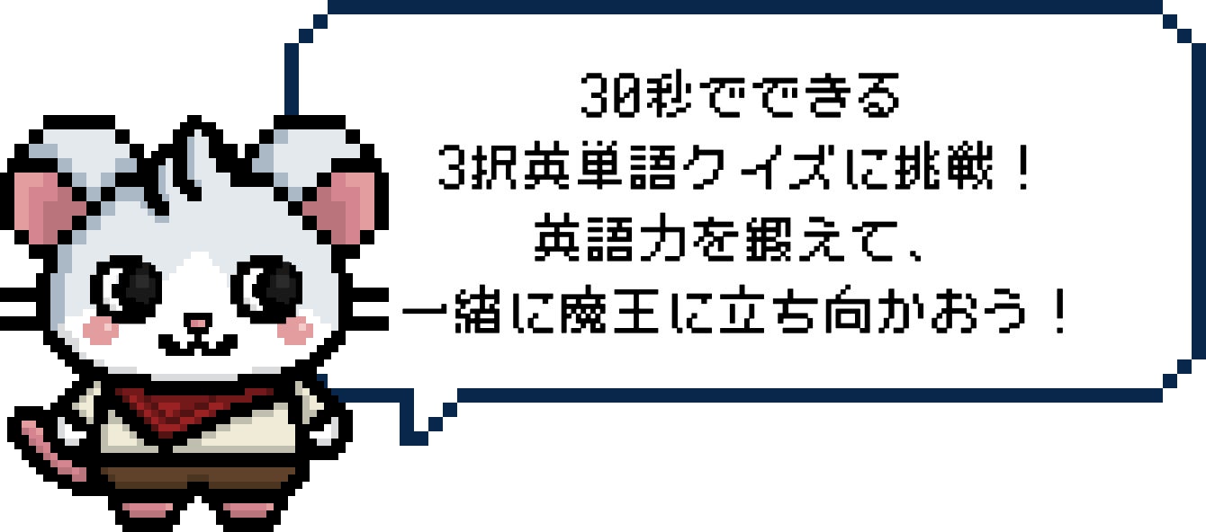 前回の「中学英単語タイムアタック」で登場した、英単語クイズを仕掛けてくる悪役"ねこ魔王"。今回はそのねこ魔王を倒す勇者になるべく修行の旅に出かける、"ねずみ君"が主人公です。