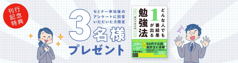 また、セミナー参加特典としてアンケートにお答えいただいた方限定で3名様に「どんな人でも1番結果が出る勉強法 合格は「あたりまえ化」の法則」をプレゼントいたします。