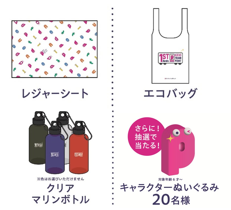期間中に1,000ポイント以上貯めた、京王トレインポイント会員を対象に、抽選で京王プラザホテル(新宿)のペアご宿泊券をプレゼントします。また、「京王アプリ」内でアンケートに回答した方に、先着で「京王トレインポイント」のオリジナルグッズのレジャーシートやエコバッグなどをプレゼントします。さらに、抽選で20名様に京王トレインポイントオリジナルキャラクターのぬいぐるみをプレゼントします。
