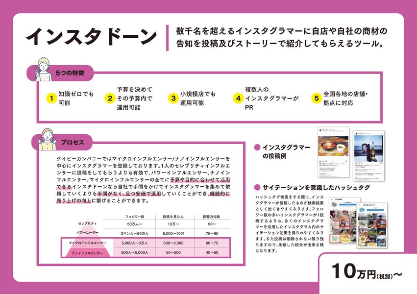投稿に対する反応が高いと言われているフォロワー数が500人以上のインフルエンサー複数人に投稿してもらうことによってInstagram内での認知を目指します。