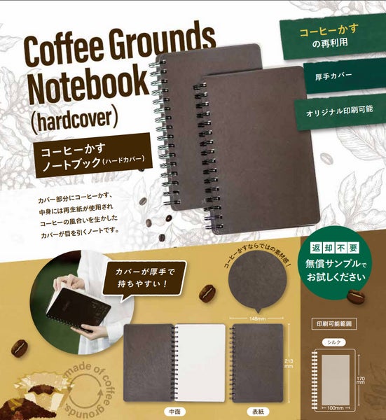 カバー部分にコーヒーかす、中身には再生紙を使用。コーヒーの風合いを生かしたデザインで、持ったままでもブレずに書きやすい丈夫なカバーがポイント。シンプルなデザインは職場や学校などさまざまなシーンに自然となじみます。カバー部分にオリジナルのロゴを入れることができる。