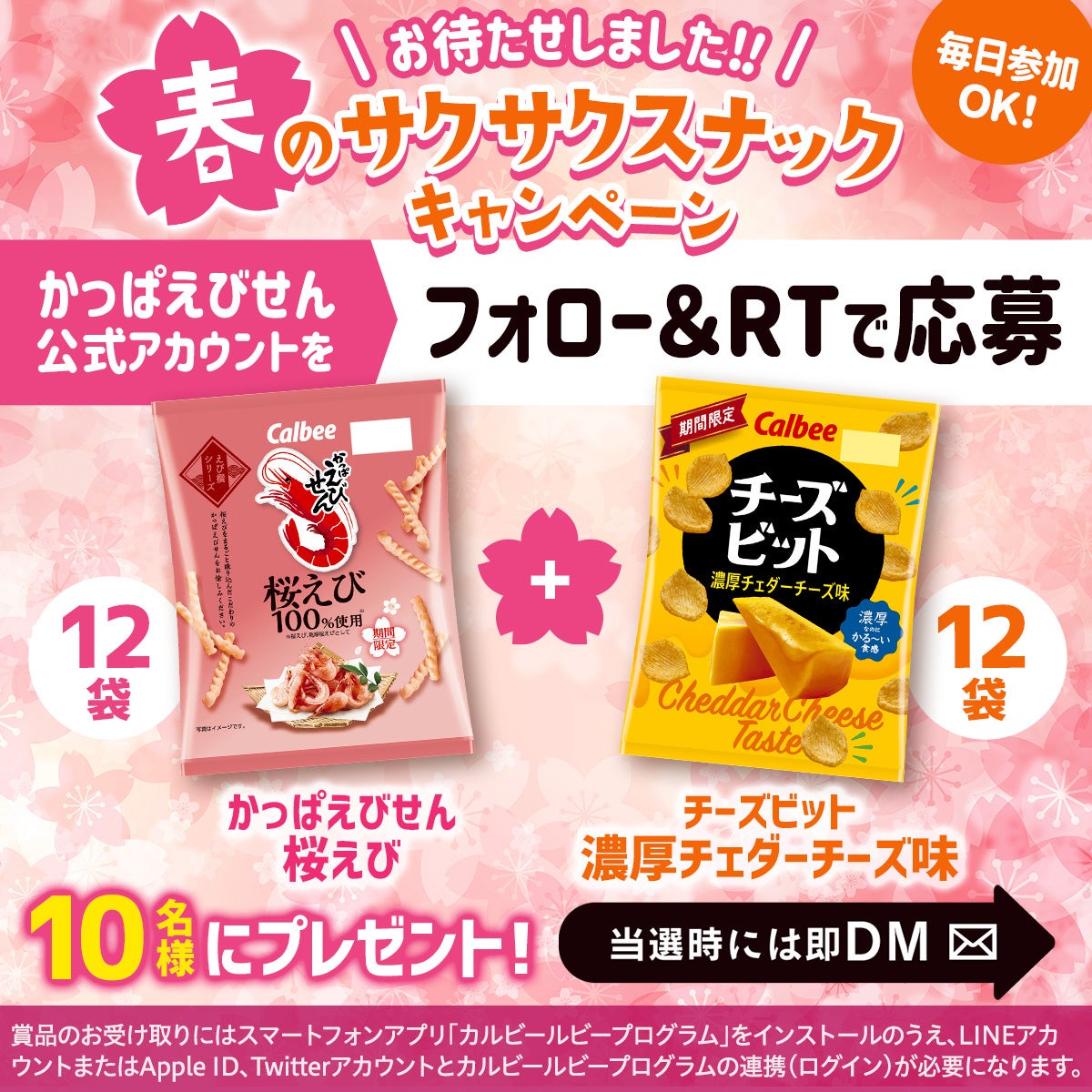 「かっぱえびせん」公式Twitterアカウントをフォローの上、キャンペーン投稿のリツイートをしていただいた方の中から抽選で『かっぱえびせん 桜えび』と「チーズビット 濃厚チェダーチーズ味」をプレゼントするキャンペーンを実施します。