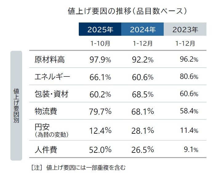 値上げ要因では、原材料の価格高騰や人手不足、流通コストに加え、近時は光熱費の上昇による値上げが再燃している。原材料などモノ由来(「原材料高」)の値上げが全体の97.9%を占めたほか、人手不足に伴う昇給・賃上げによるコスト増を背景とした「人件費」(52.0%)は、要因別の集計を開始した2023年以降で最高だった。また、特に6月以降の値上げを中心に電気・ガスなど「エネルギーコスト(光熱費)」由来の値上げが急増し、年間でも66.1%を占めるなど、2年ぶりに前年を上回る水準で推移した。トラックドライバーの時間外労働規制などが要因となった輸送コストの上昇分を価格に反映する「物流費」由来の値上げは79.7%を占め、前月調査時(81.8%)から割合が低下した。