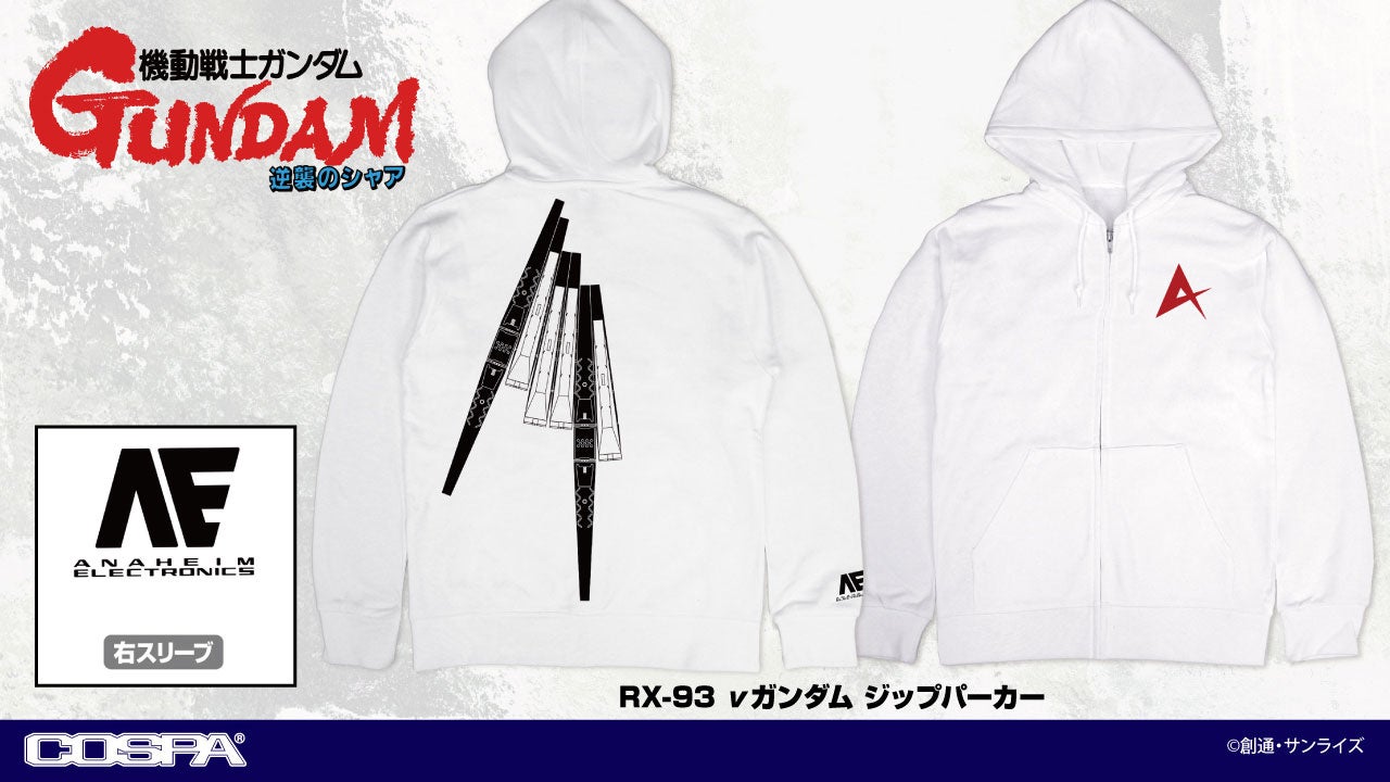 さらに『機動戦士Vガンダム』からは「V2アサルトバスターガンダム」をTシャツに初デザイン、そして『機動戦士ガンダム 逆襲のシャア』より、自らν(ニュー)ガンダム気分を楽しめる背中に大きくフィン・ファンネルをデザインした「RX-93 νガンダム」ジップパーカーもラインナップ。