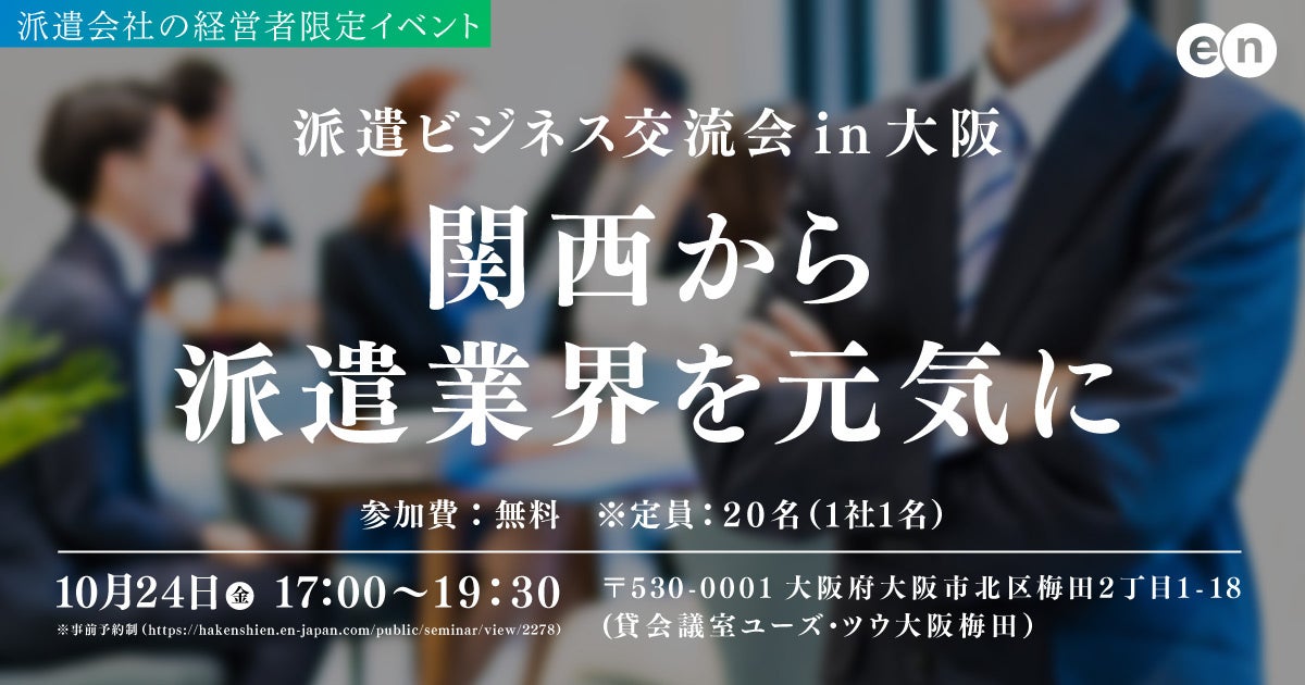 エン・ジャパン株式会社(本社:東京都新宿区、代表取締役会長兼社長:越智通勝)は、2025年10月24日(金)に派遣会社の代表限定の「派遣ビジネス交流会」を大阪にて初開催いたします。今回のテーマは「関西から派遣業界を元気に」。派遣会社の代表の皆様は是非ご参加ください。