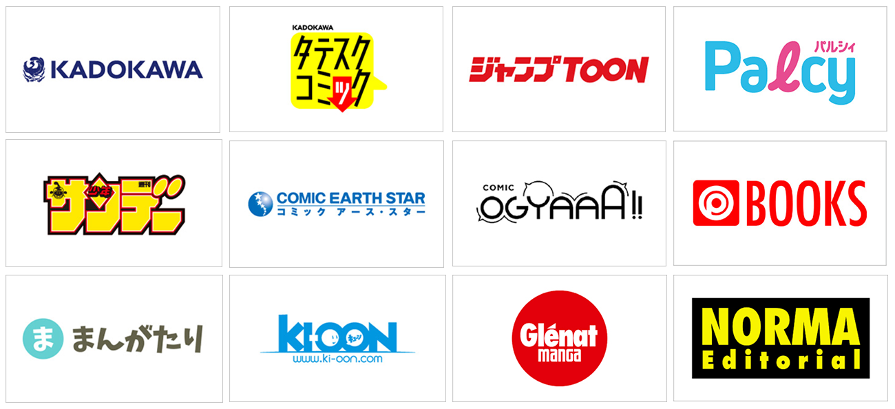 KADOKAWA、TATESC COMICS、ジャンプTOON、Palcy、少年サンデー、コミック アース・スター、コミックオギャー!!、プレステージ出版、まんがたり、Ki-oon、Glénat Manga、Norma Editorial