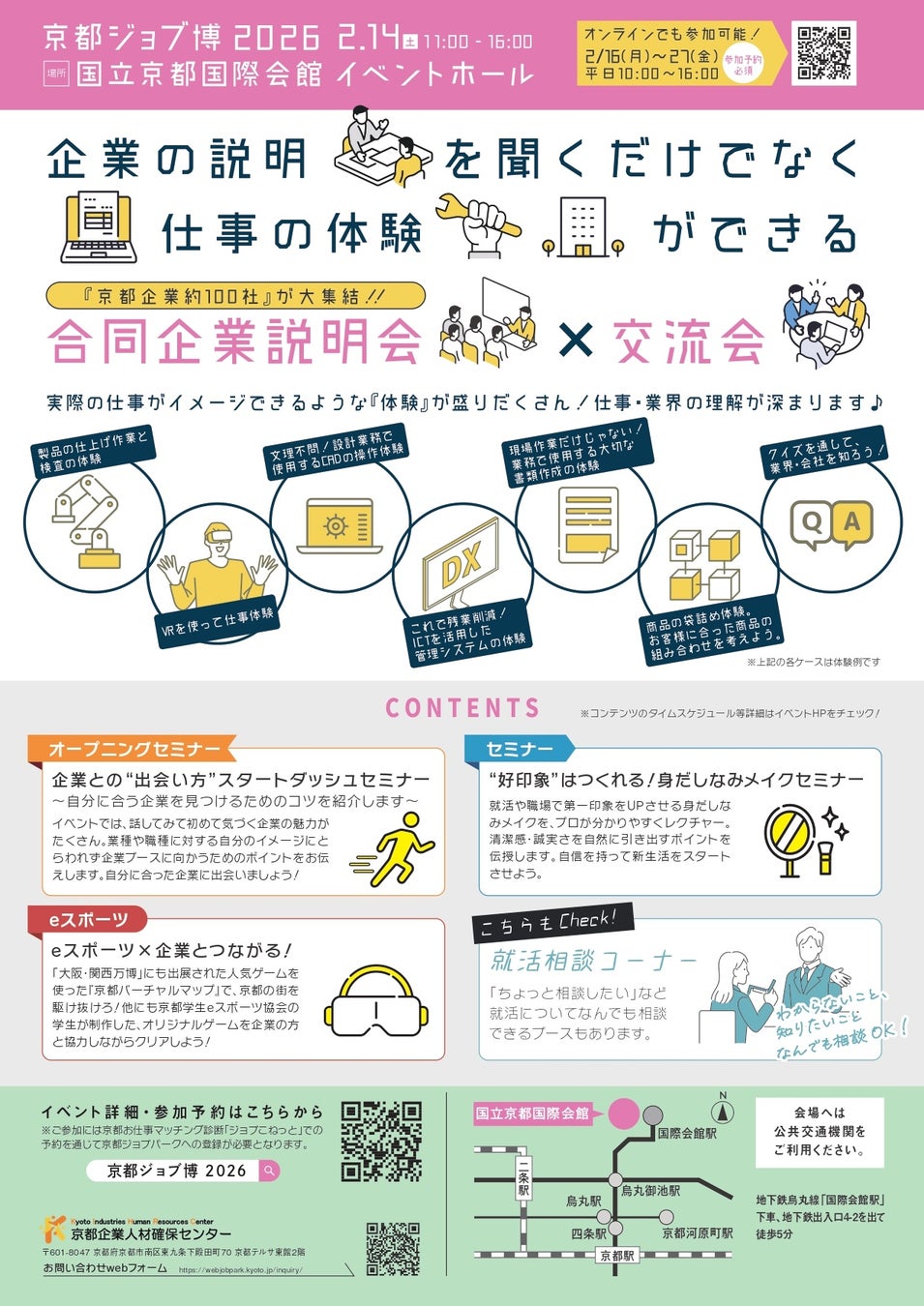 ■京都府では、学生等若年求職者に対し、働きやすい職場環境づくりに取り組む府内企業の企業研究を促進するため、約100社が参加する大規模イベント「京都ジョブ博2026」を2月14日(土)に、国立京都国際会館で開催します。