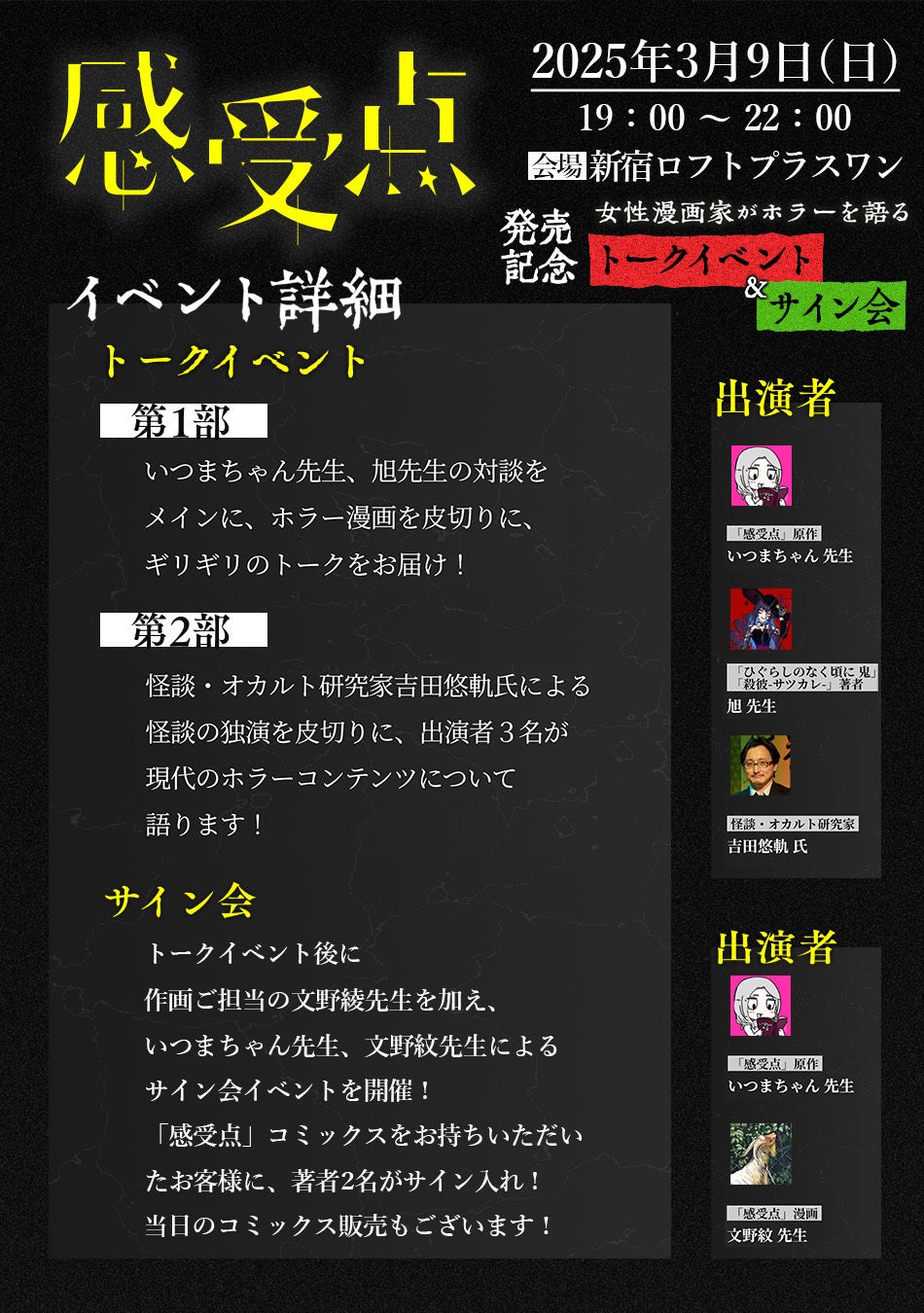 第一部ではいつまちゃん先生、旭先生の対談をメインに、ホラー漫画をテーマにしたギリギリのトークをお届け。第二部では怪談研究家の吉田悠軌氏による怪談の独演を皮切りに、出演者3名による現代のホラーコンテンツを語るトークショーをお届けします。