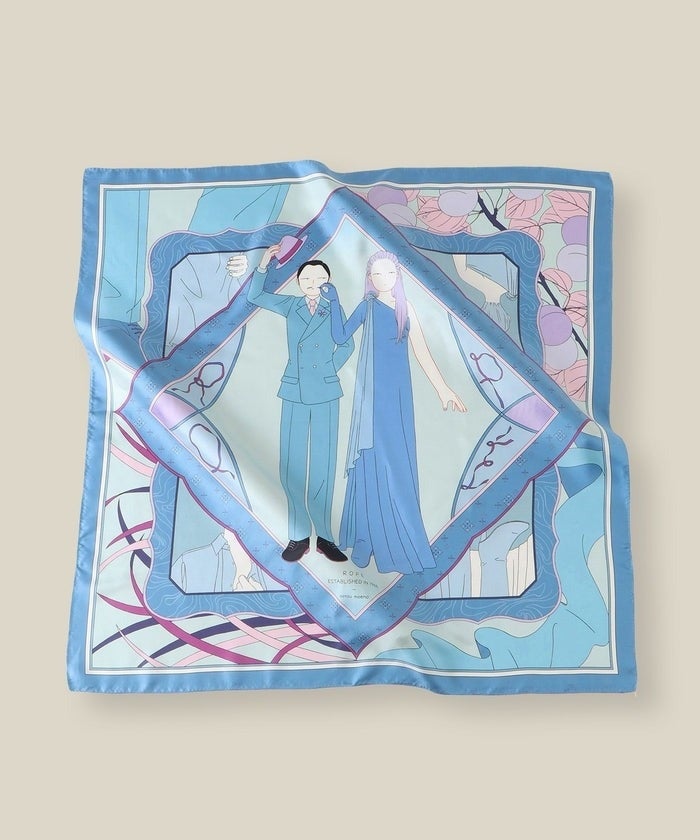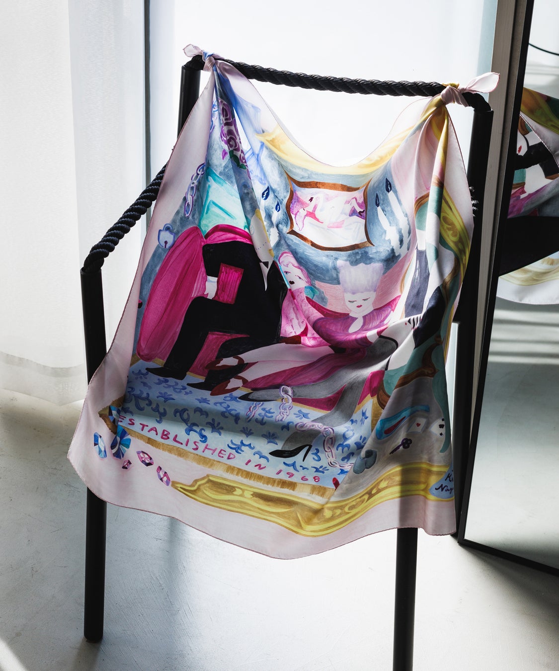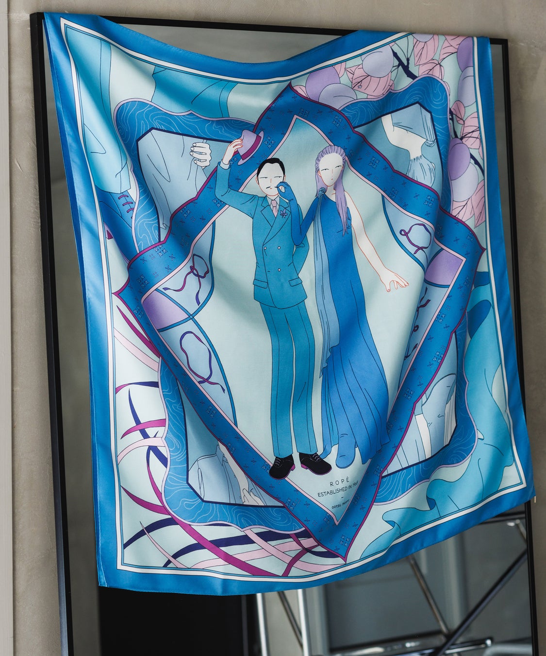 著名な写真家やアーティストの手掛けてきた、60 年代から現代に至るまでの「ROPÉ」のブランドビジュアルやムービーの中から4 作品をテーマに、4 名のアーティストがそれぞれ独自の視点で再解釈しデザインを描きました。スカーフの素材は、程よい厚みと光沢のあるツイル調シルク生地で、その上に色鮮やかなデザインをプリント。