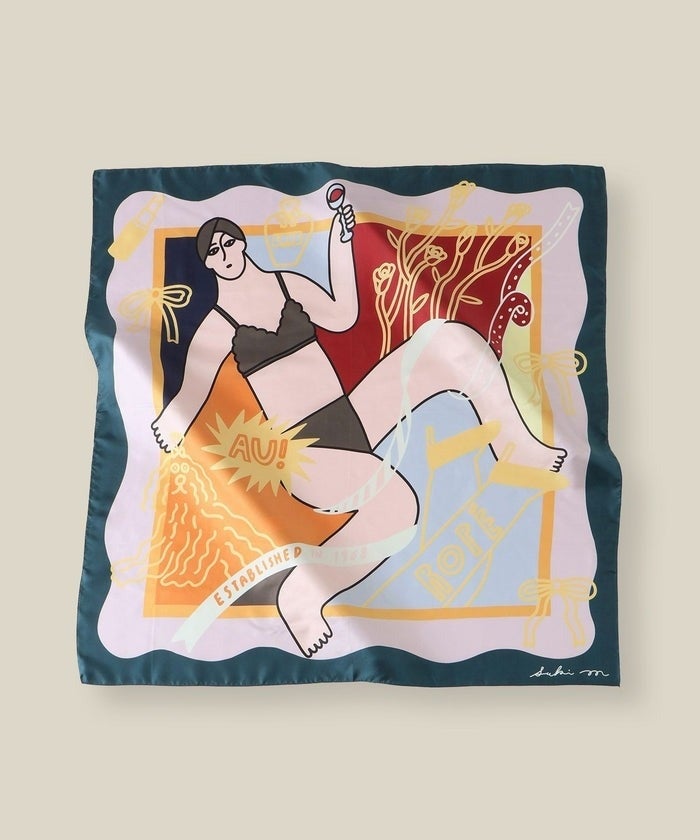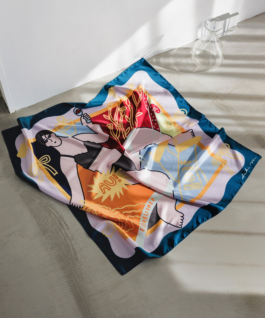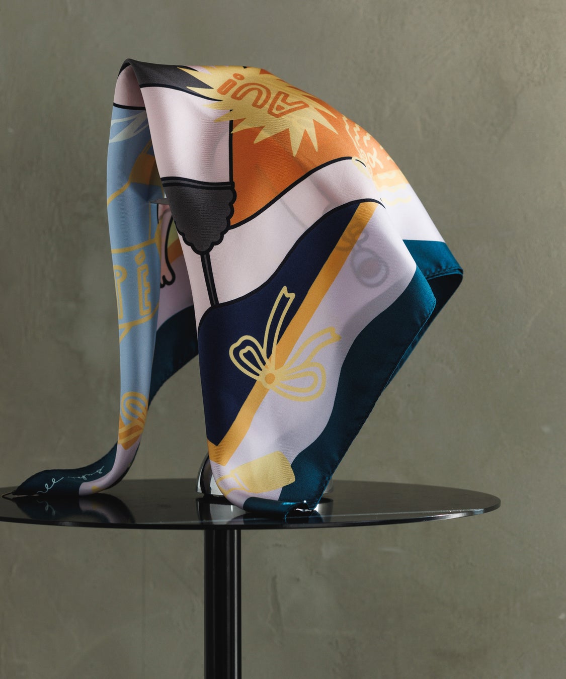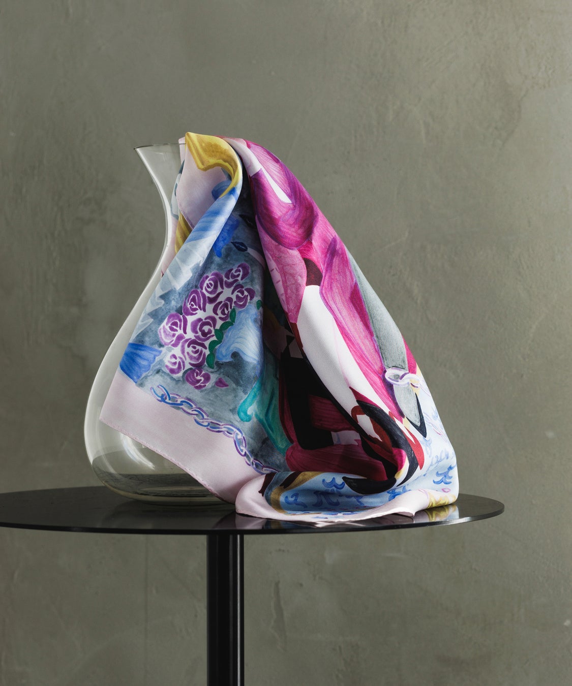 著名な写真家やアーティストの手掛けてきた、60 年代から現代に至るまでの「ROPÉ」のブランドビジュアルやムービーの中から4 作品をテーマに、4 名のアーティストがそれぞれ独自の視点で再解釈しデザインを描きました。スカーフの素材は、程よい厚みと光沢のあるツイル調シルク生地で、その上に色鮮やかなデザインをプリント。