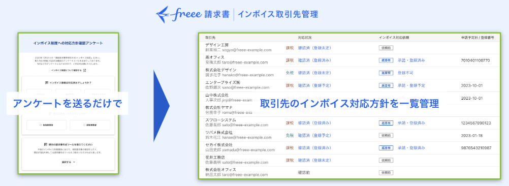 freee株式会社(本社:東京都品川区、CEO:佐々木大輔)は「freee請求書/インボイス取引先管理」において取引先に聞きづらいインボイス制度への対応方針に関するアンケートをメールで一括送信できる機能をリリースしました。