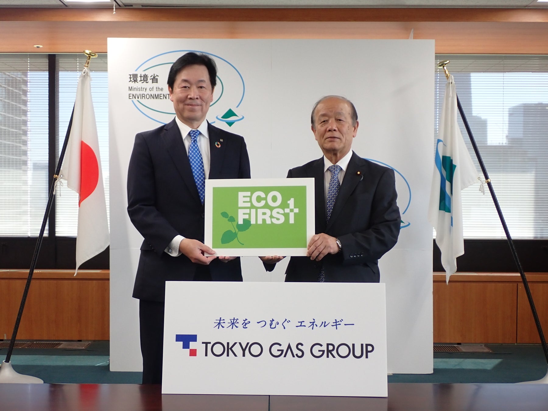 4月10日に環境省で行われた認定式の様子:左から東京ガス社長 笹山晋一 、環境副大臣 八木哲也