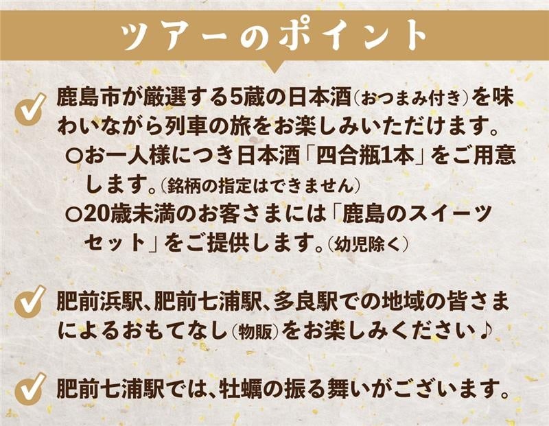 JR 九州では、佐賀県鹿島市・太良町の協力のもと、長崎地区で活躍するYC1 系車両にご乗車いただき、佐賀駅から肥前大浦駅までを特別運行する日帰りツアーを発売します。ツアーでは、車内にて鹿島市の日本酒のご提供や肥前七浦駅では牡蠣のふるまいを予定しております。途中駅でのおもてなしもお楽しみください。佐賀県・長崎県観光キャンペーン「GO QUEST」で西九州エリアが盛り上がっているこの機会に、ぜひ鹿島市・太良町の魅力に触れてみませんか。皆さまのご参加をお待ちしています!