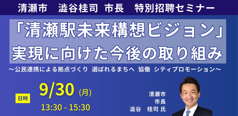 JPI(日本計画研究所)は、清瀬市 市長 澁谷 桂司 氏を招聘し、「清瀬駅未来構想ビジョン」実現に向けた今後の取り組みについて詳説いただくセミナーを開催します。
