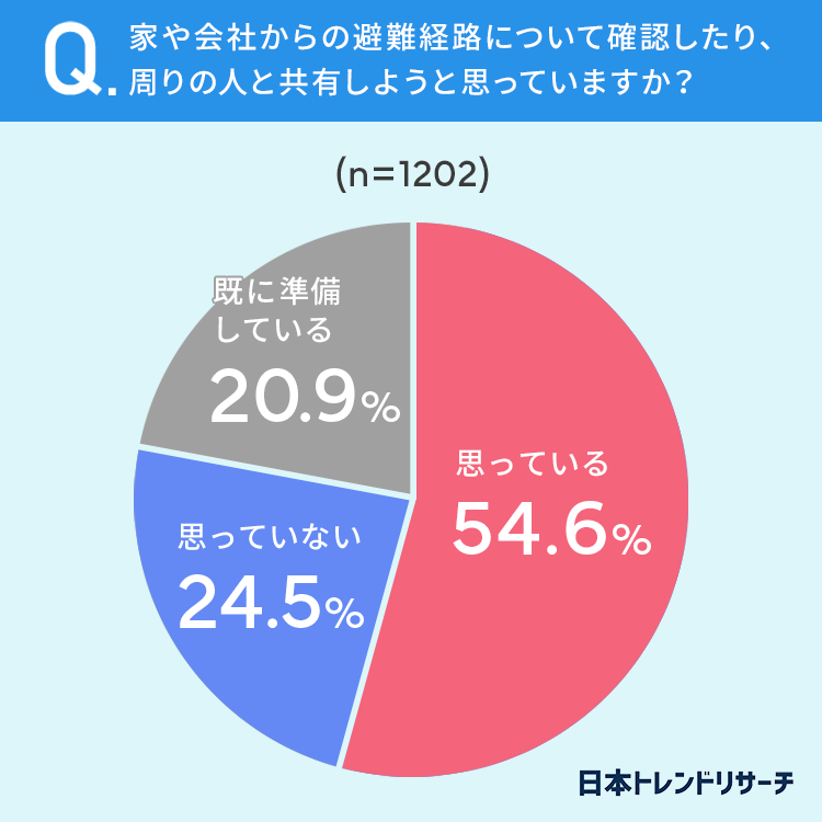さらに、家や会社からの避難経路についての確認したり、周りの人と共有しようと思っているか聞いてみました。