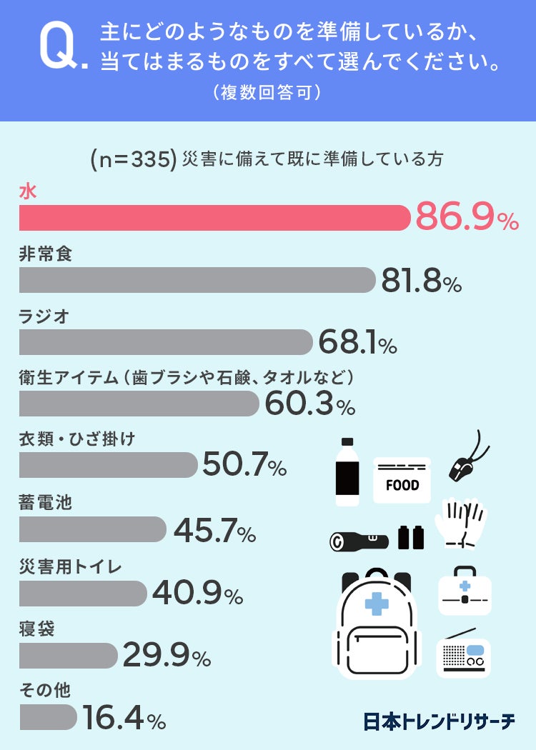 「水」が86.9%で1位、「非常食」が81.8%で2位という結果になりました。