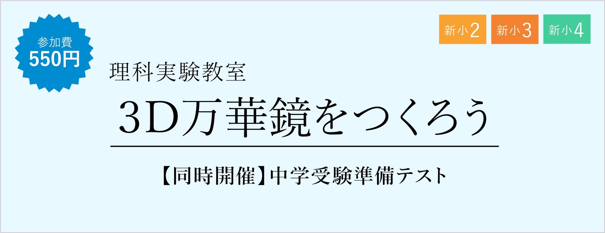 株式会社増進会ホールディングス(Z会グループ)のグループ会社、株式会社栄光(本社:東京都千代田区 代表取締役社長:下田勝昭)が運営する進学塾・栄光ゼミナールは新小学2~4年生(現小学1~3年生)と保護者を対象に、理科実験教室「3D万華鏡をつくろう」を、2024年2月23日(金・祝)・24日(土)・25日(土)、3月2日(土)・3日(日)に開催します。鏡を使った3D万華鏡作りに親子で取り組み、ものの見え方を予想・実際に観察します。中学入試でよく出題される「光の反射」について、自らの体験を通じて興味を持って学ぶことができます。また、同時開催の「中学受験準備テスト」では、中学入試の出題傾向を意識した発展的な問題を出題します。お子さまの現在の学習状況と今後の課題の把握にご活用ください。