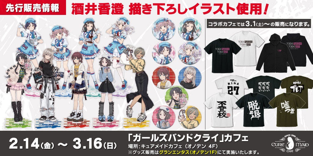 「アクリルスタンド(大)」など一部商品は、2025年6月の一般販売に先駆けて、2月14日(金)~3月16日(日)CURE MAID CAFÉ(キュアメイドカフェ)[秋葉原:オノデン4F/ジーストア・アキバ内]で開催のコラボカフェ〈「ガールズバンドクライ」カフェ〉にて先行販売も決定です。