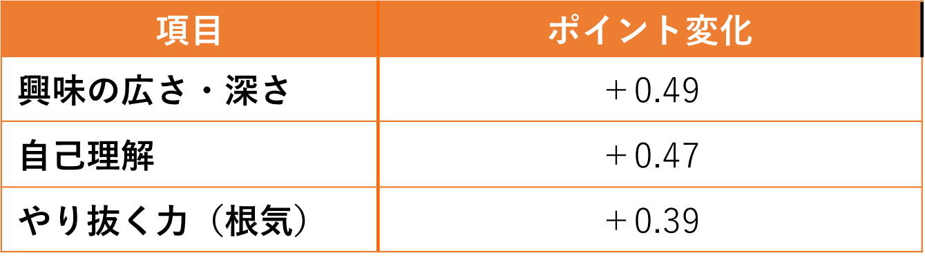 非認知能力を含めた自己評価全体について、受講前の数値と全講座受講後の数値との差分平均値を見た場合、47名中37名(78.7%)で自己評価が向上していました。