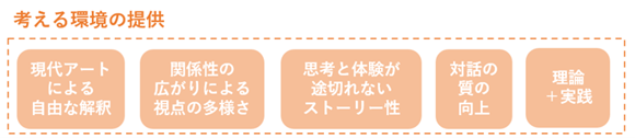本プログラムで鑑賞するBASNの現代アート作品には特定の解釈がなく、解釈の可能性は人それぞれに異なり無限大です。そのようなアート作品について、問いかけたり対話したりすることで、参加者の表現力、他人と異なる意見を認め合う共感力、批判的思考力、想像力などを養うことができます。