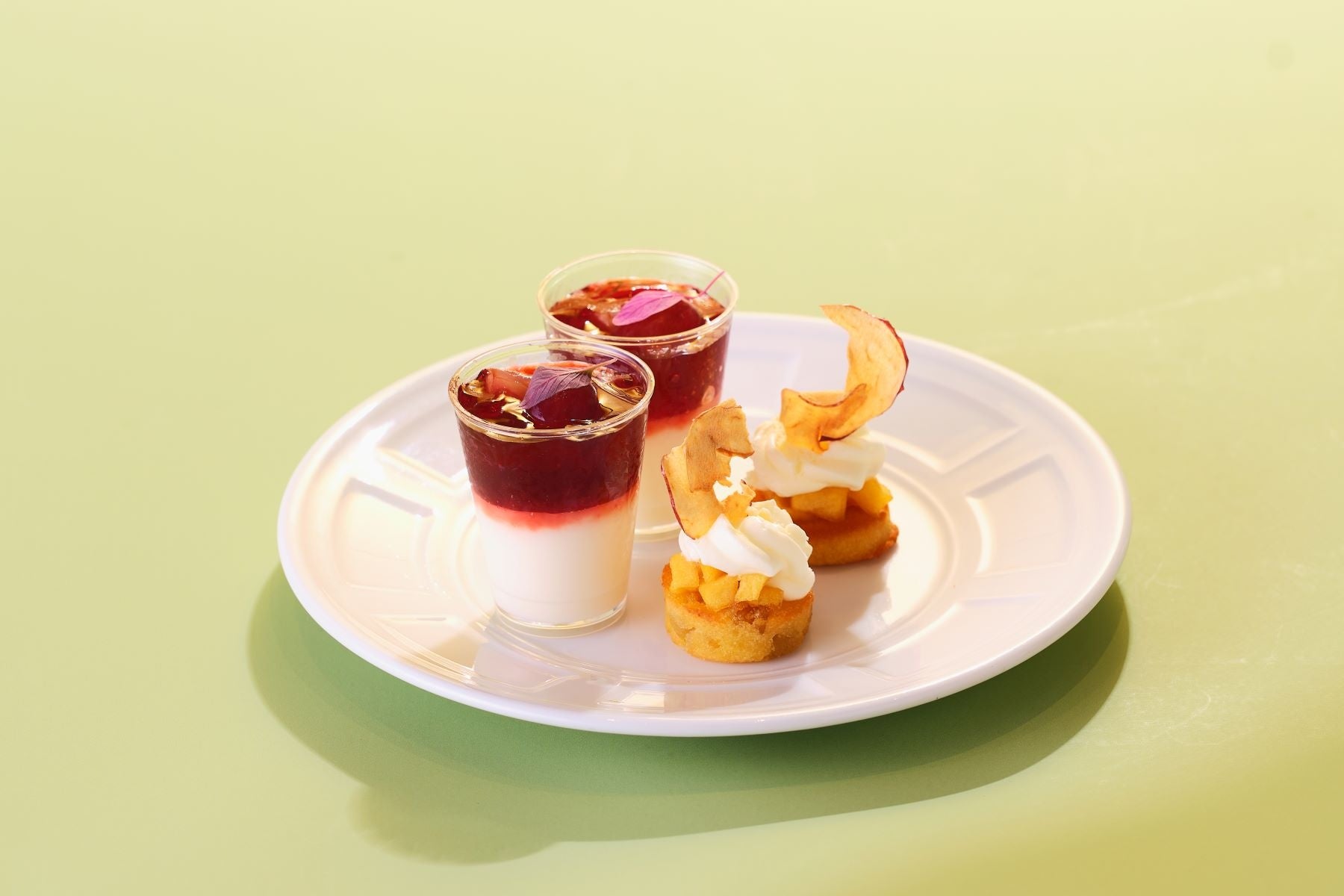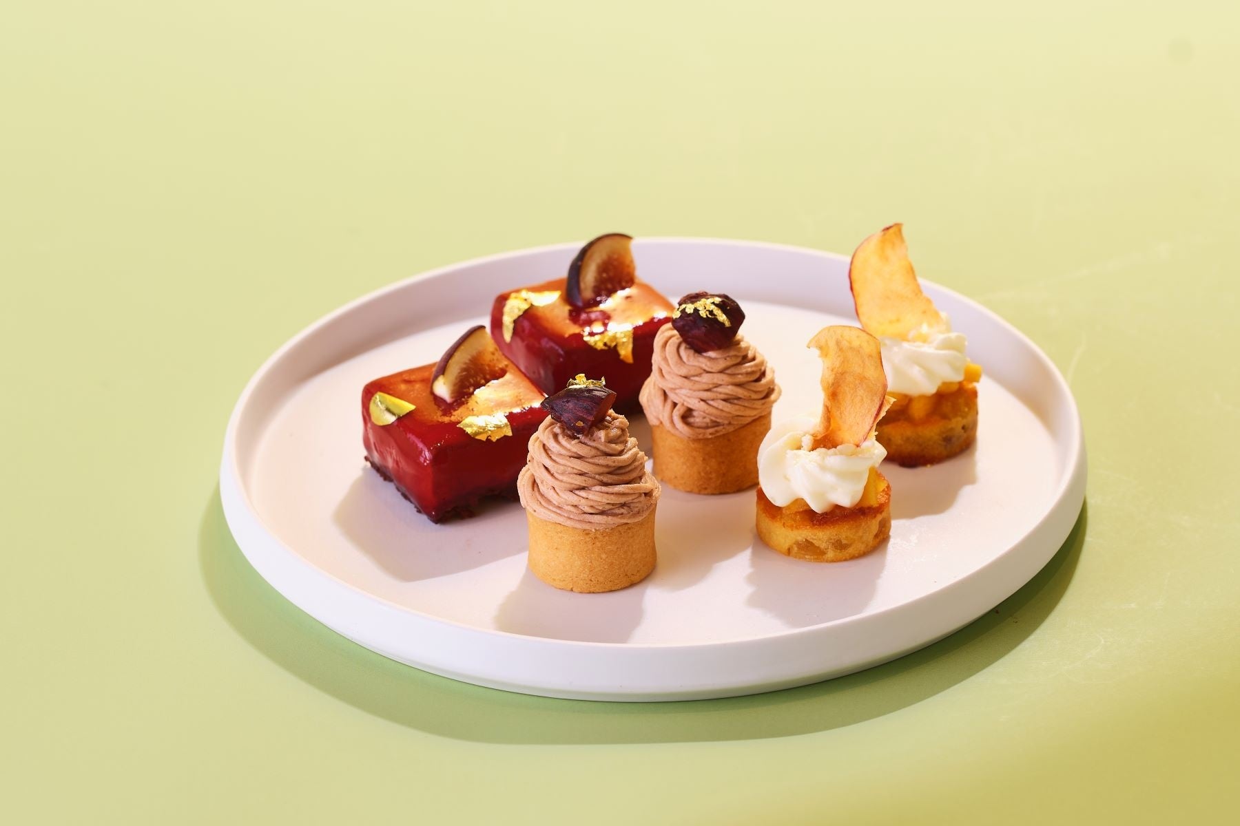 <上段>デザート:ザクロとブドウのジュレ/かぼちゃマカロン/栗と餡の最中