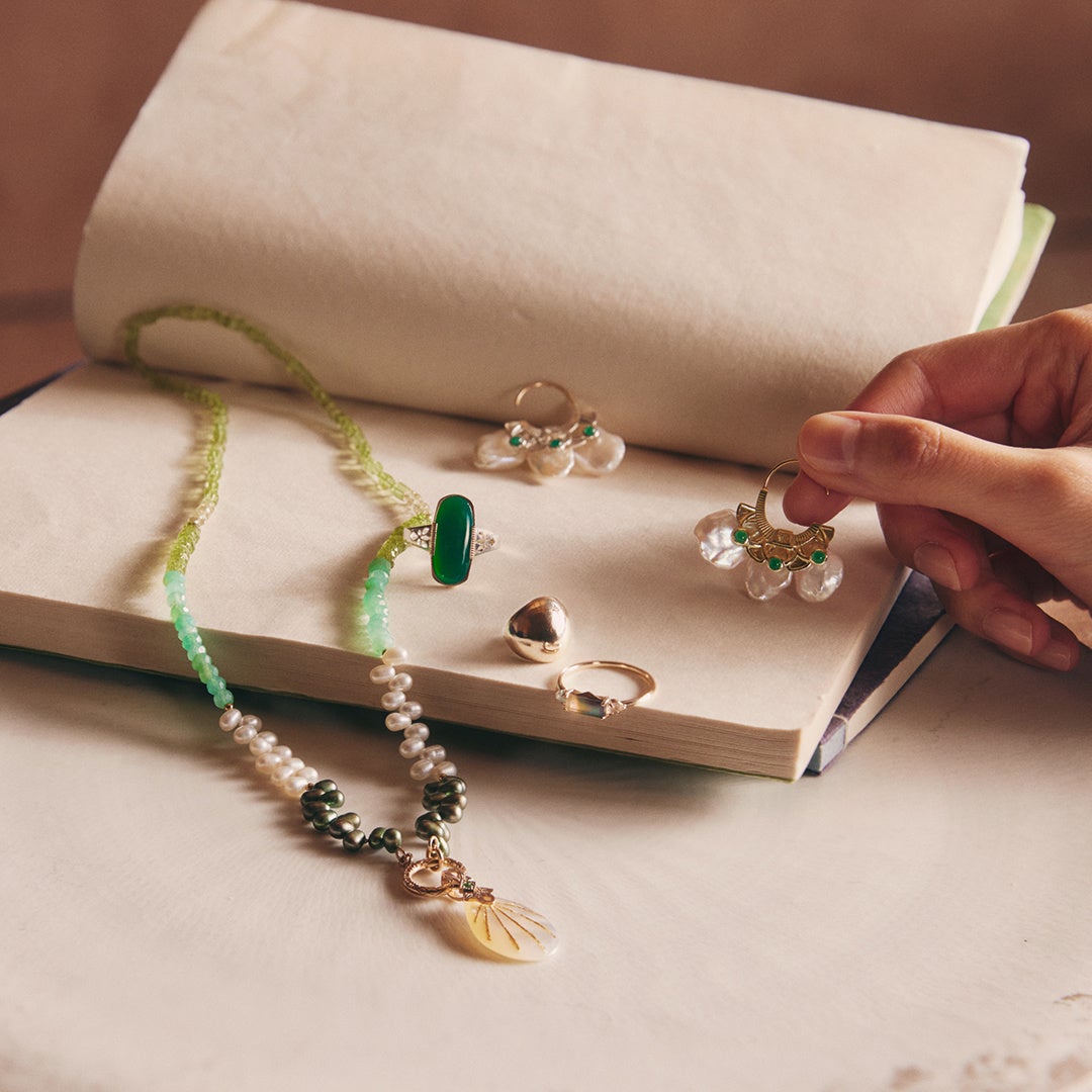 グリーンクォーツと白蝶貝のダブレットストーン*は植物が放つしなやかな生命力のように凛と輝き、まるで光を浴びて揺らめく水面のよう。