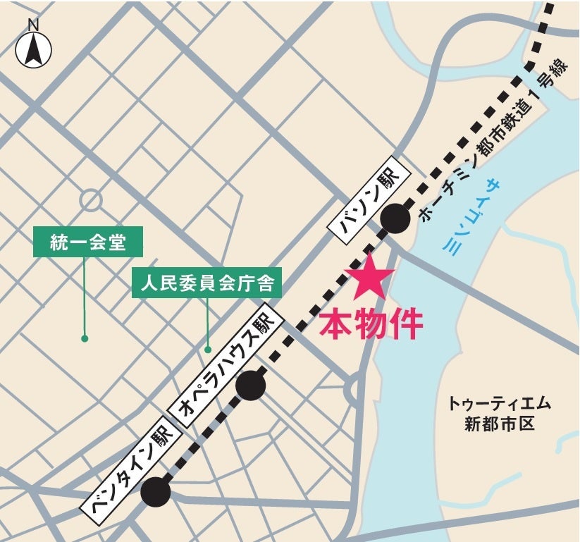 本物件は、ホーチミン市の中心部である1区内に位置しています。中心部の中でも、2024年12月に開業したホーチミン都市鉄道1号線や、新都市エリアと接続する橋などが整備された交通結節点にあたる、オフィス、商業施設、ホテルなどが集積する成長著しいエリアです。本物件は、本1号線のバソン駅からは、徒歩3分でアクセスができる好立地です。