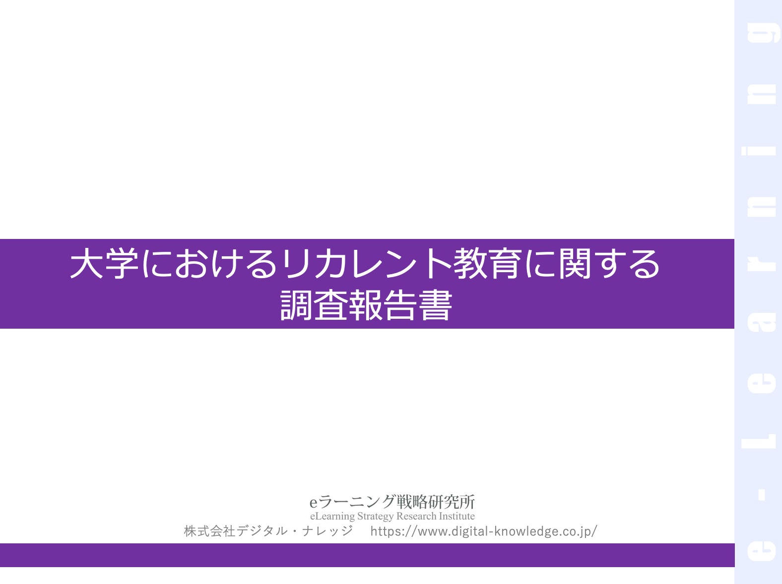 eラーニング専門ソリューション企業、株式会社デジタル・ナレッジ(本社:東京都台東区、代表取締役社長:はが弘明)が運営するeラーニング戦略研究所は、全国の大学職員・教員を対象に、大学におけるリカレント教育の実施状況に関する調査を実施し、その結果をまとめた報告書を本日公開致しました。