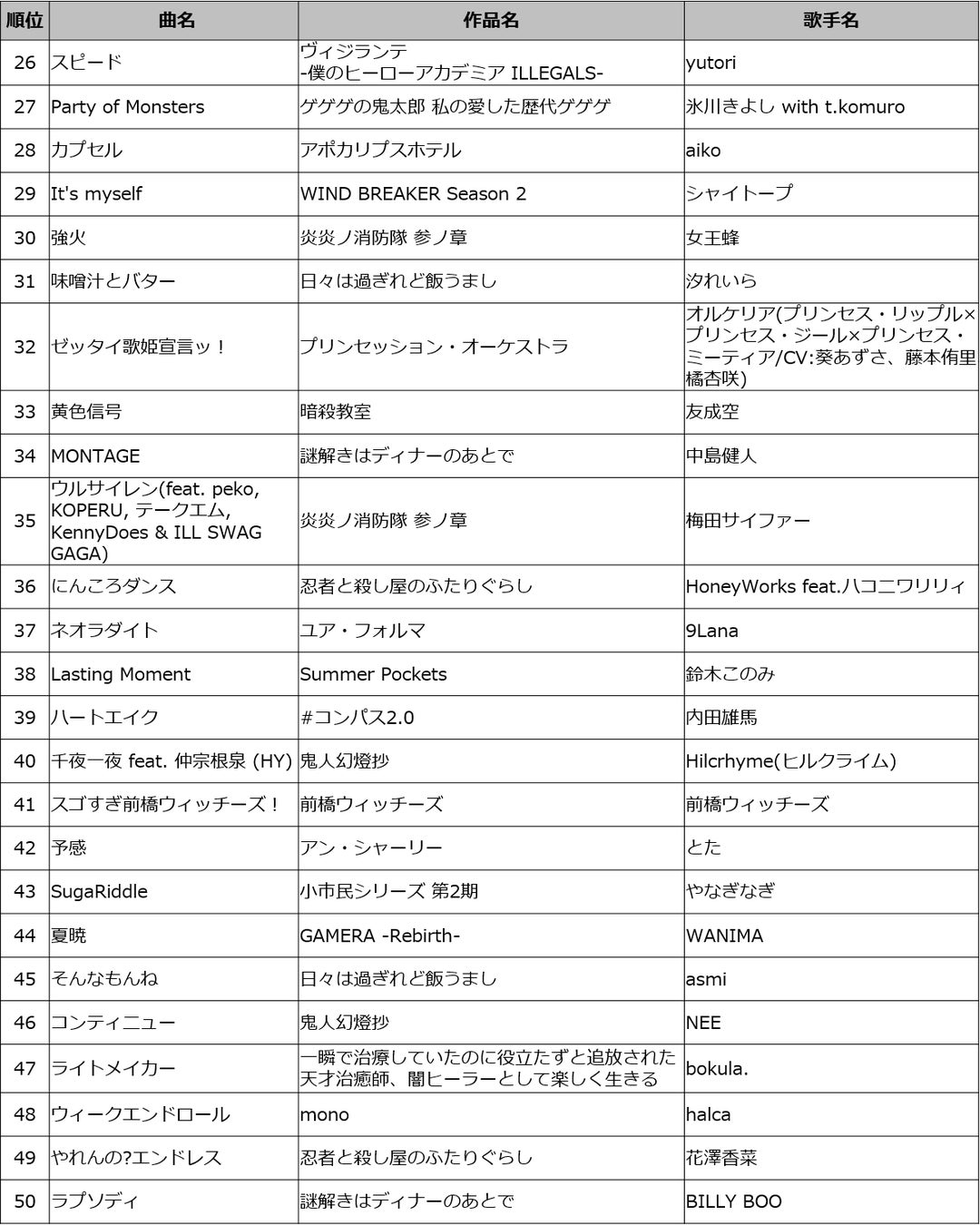 ■DAM 2025年春アニメ主題歌 カラオケランキング TOP50(26位~50位)