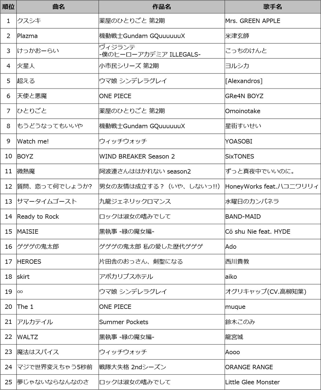 ■DAM 2025年春アニメ主題歌 カラオケランキング TOP50(1位~25位)