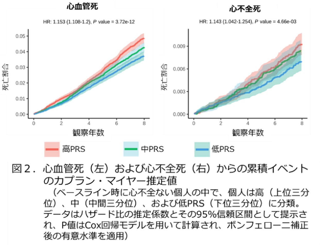 ・ さらに研究グループは、心不全発症や死亡リスクを予測する「多遺伝子リスクスコア(PRS)(注4)」を独自に開発しました。日本人集団に最適化されたこのスコアは高い精度を示し、高リスク者の早期発見や死亡リスクの層別化が可能となりました(図2)。PRSが高い人は、若くして心不全を発症するリスクが高く、さらに診断時にはまだ心不全でない人でも、将来的な死亡リスクが高いことが分かりました。