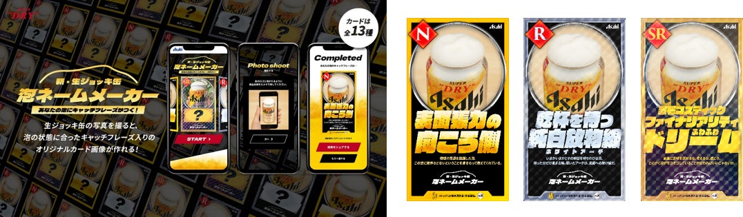 「新・生ジョッキ缶 泡ネームメーカー」は、特設サイトからカメラを起動して開栓した「スーパードライ 生ジョッキ缶」にスマートフォンをかざすと、「生ジョッキ缶」の泡の状態に応じてAIがキャッチコピーを作成し、デジタル上でオリジナルのカード画像が生成されます。カードの種類は「ノーマル」「レア」「スーパーレア」と出現率が異なる全13種類で何度でも楽しめる“ワクワク感”を提供します。