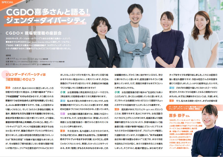 2025年7月には、ジェンダーダイバーシティレポート第3号を発行。ダイバーシティ推進を担うCGDO(Chief Gender Diversity Officer)喜多と社員の座談会や、SBU(※1)ごとの2024年度実績を掲載。各SBUのコミットメントや具体的な取り組み状況も掲載し、パーソルグループの現在地とこれからの課題を社員に向けて発信しました。