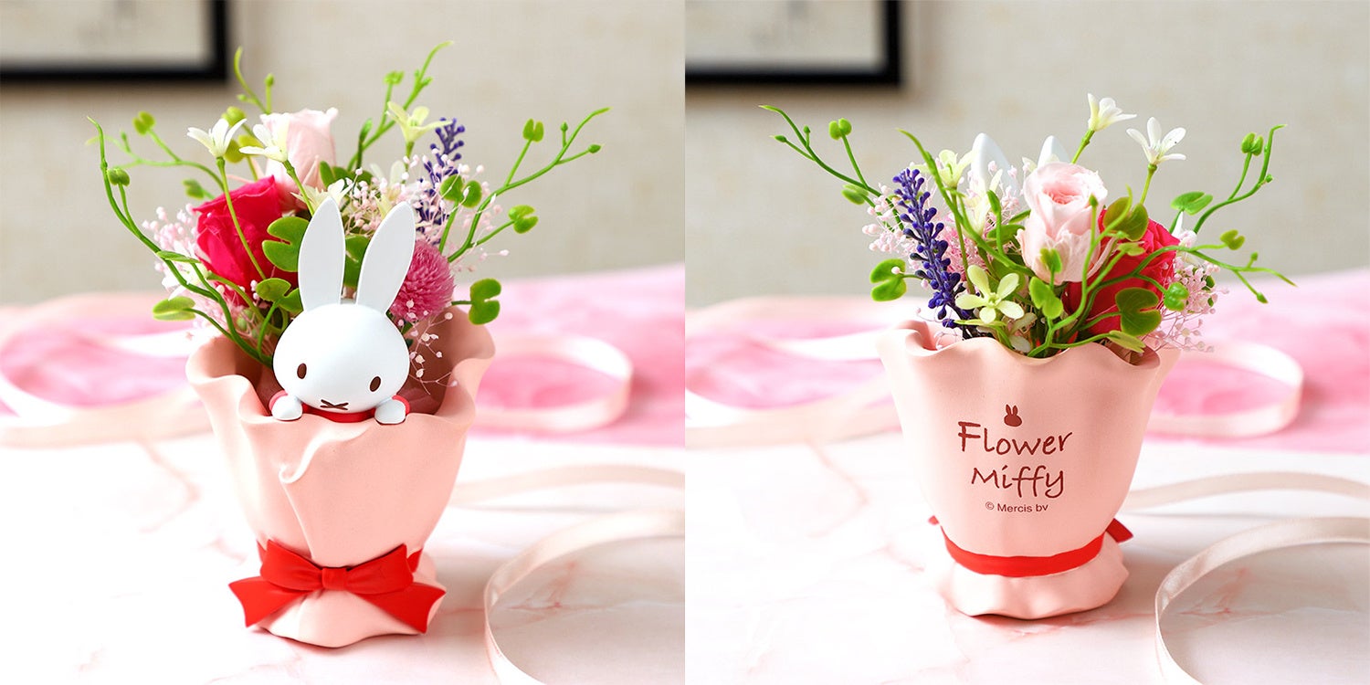 ブーケの形をしたポットの中からミッフィーがちょこんと覗く愛らしいフラワーアレンジ。