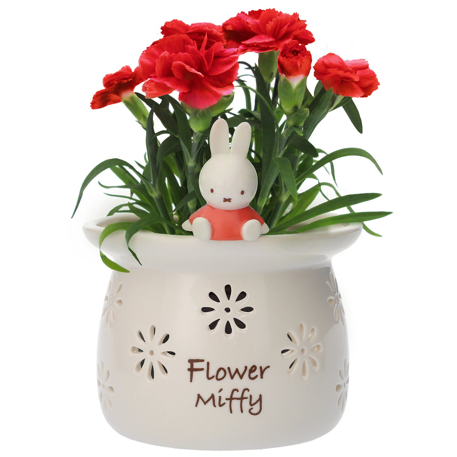 ミッフィーがおすわりしたシンプルな陶器ポットに、カーネーションをセットしてお届けいたします。