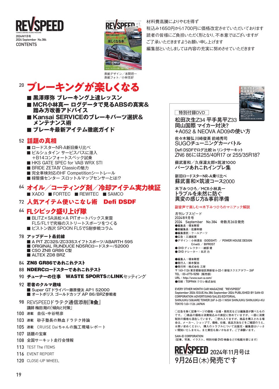 レブスピード2024年9月号発売!誌面特集は『ブレーキングが楽しくなる本』。付録DVDは豪華6本立て!『岡山国際サーキット 松田次生Z34 平手晃平Z33 マイカー対決?』など。