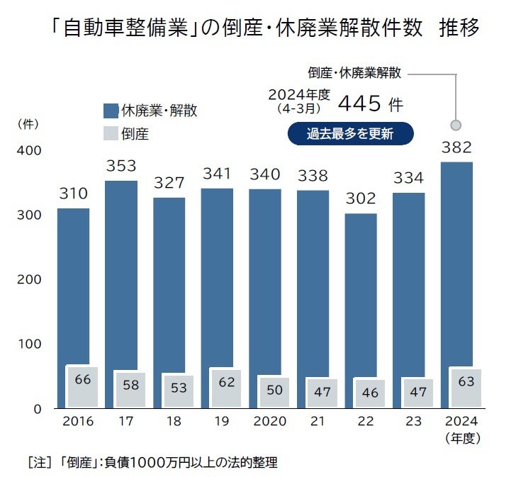 自動車整備を担う事業者の市場撤退が加速している。2024年度(2024年4月〜2025年3月)に発生した「自動車整備」事業者の休廃業・解散(廃業)は382件となり、過去最多を更新した。前年度(334件)から約15%増加したほか、倒産(負債1000万円以上、法的整理)に至った63件を含めると、過去最多となる445件が自動車整備の現場から消滅した。
