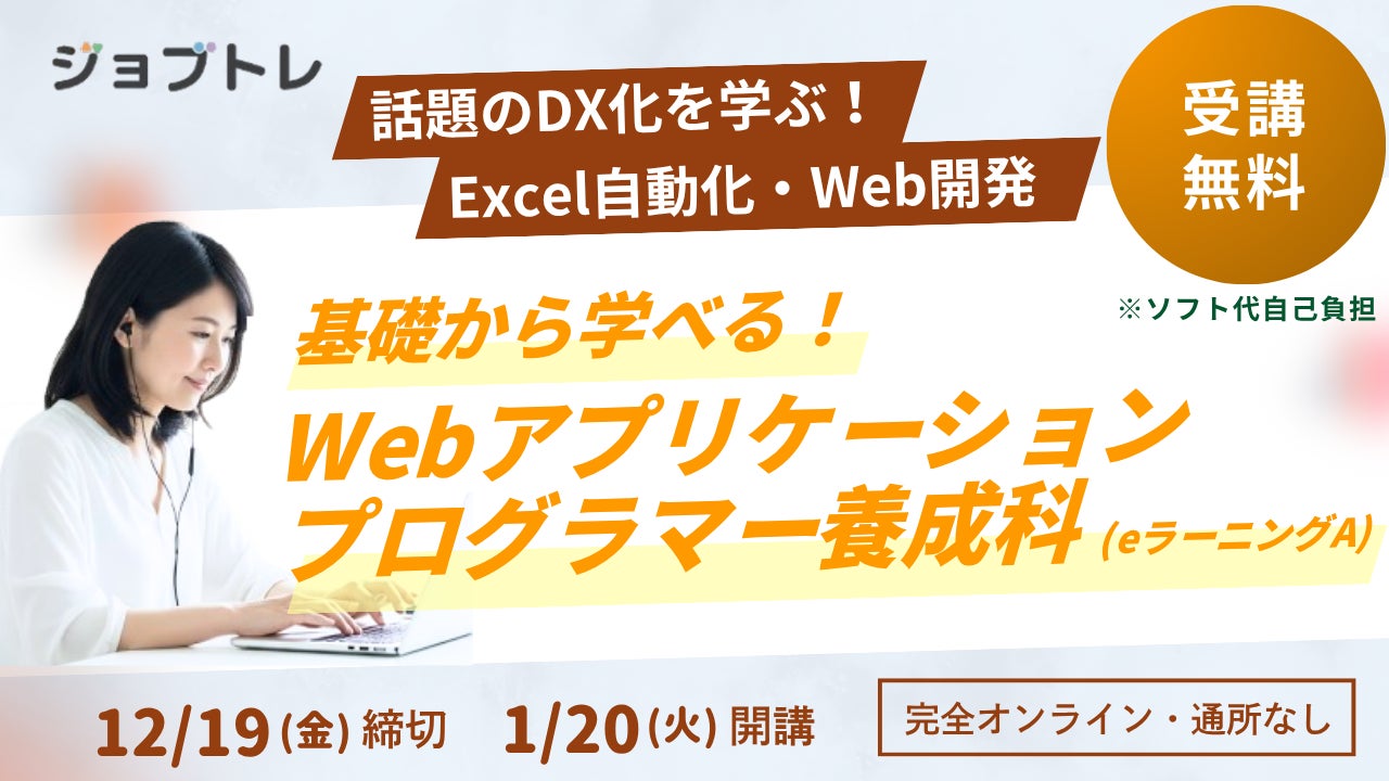 【Excel自動化 × Webアプリ開発】プログラミングが学べる求職者支援訓練「基礎から学べる!Webアプリケーションプログラマー養成科(eラーニングA)」1/20開講!受講生募集開始
