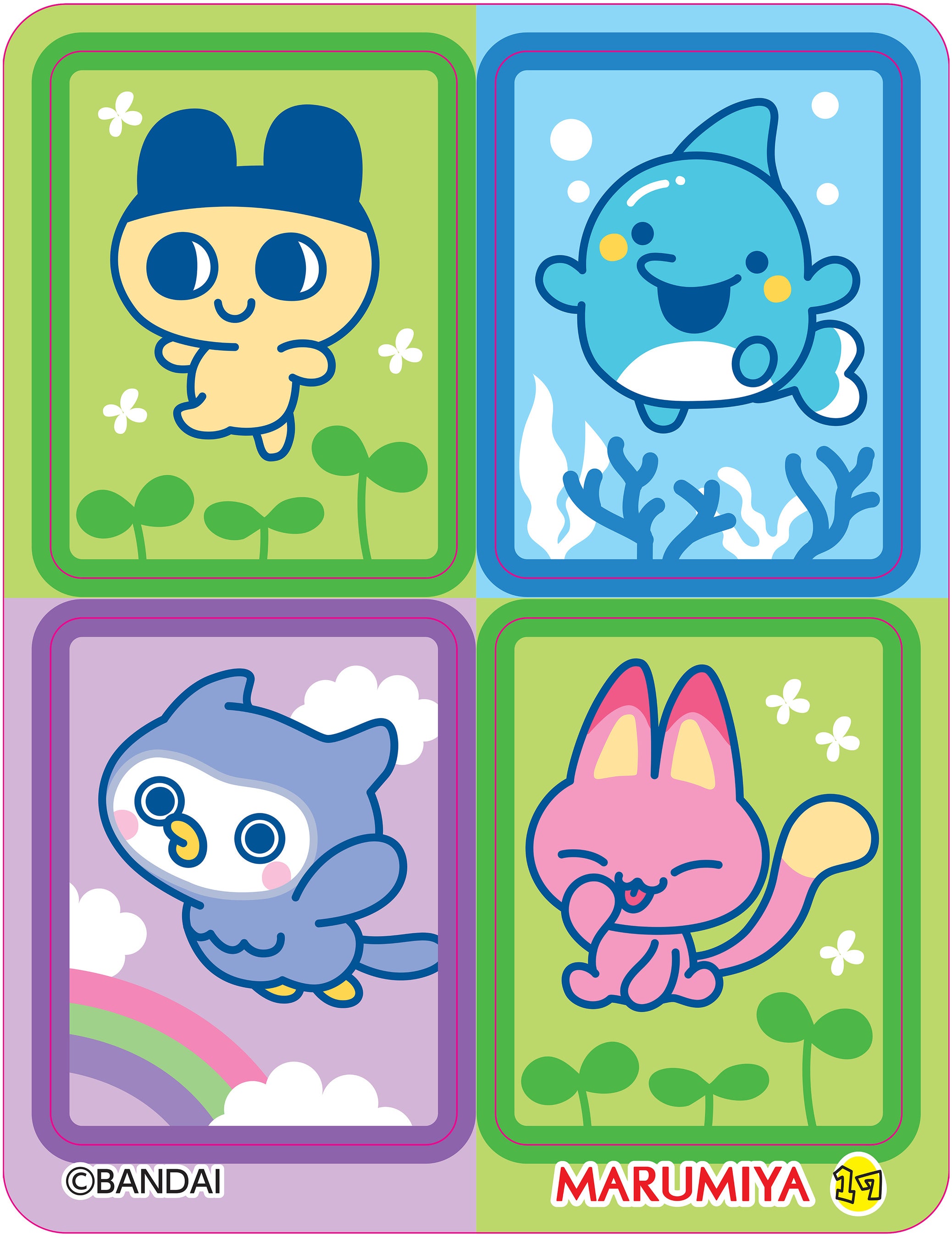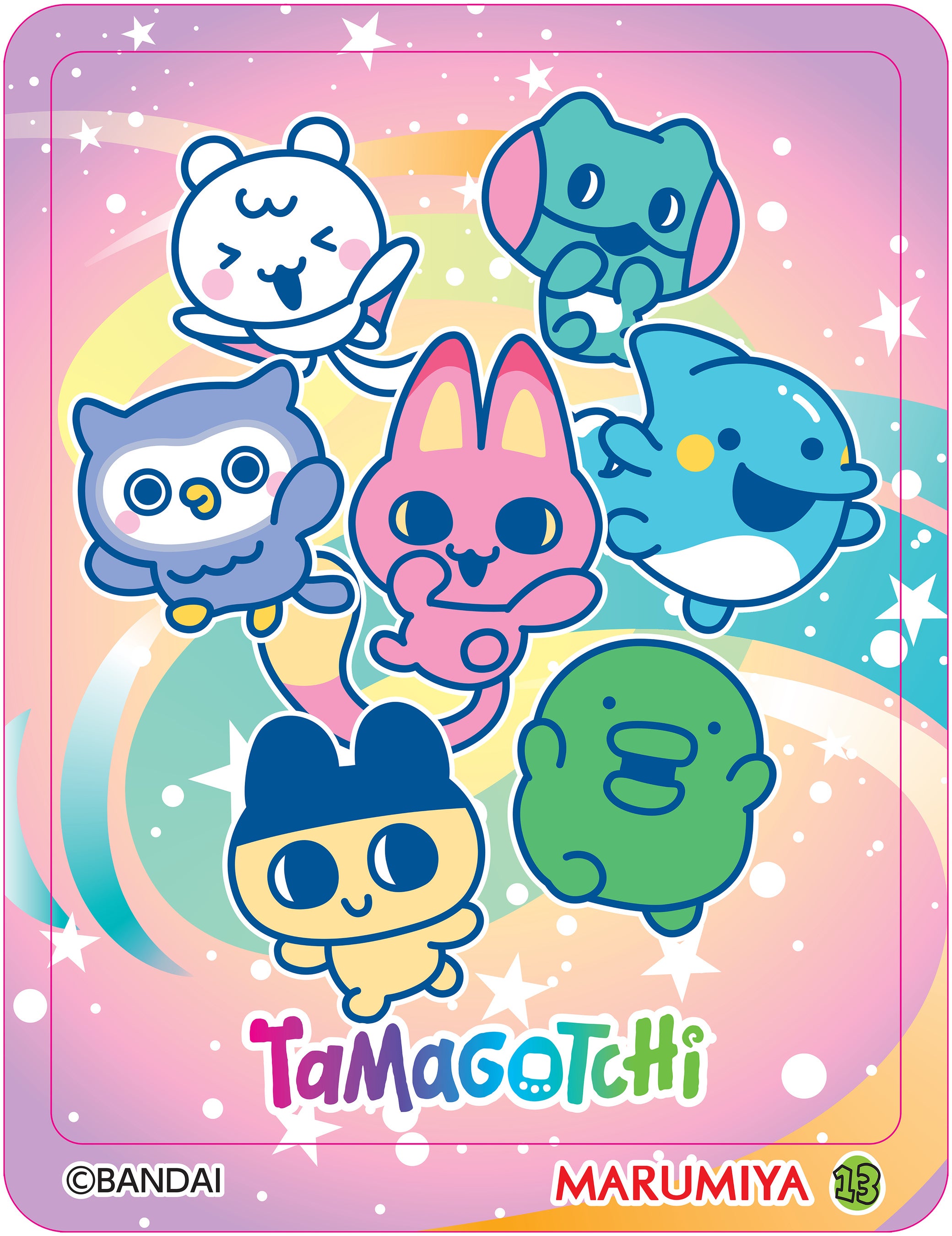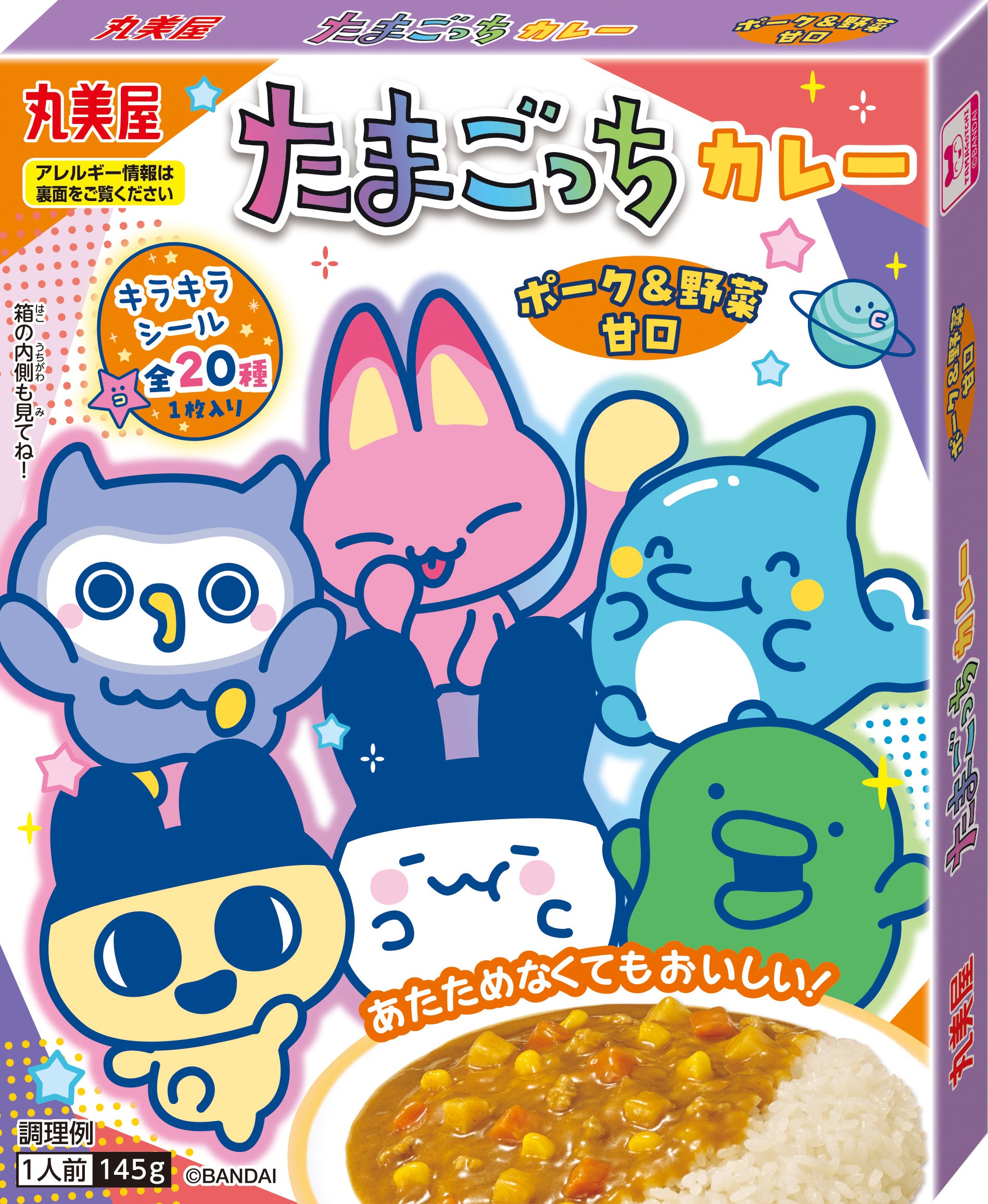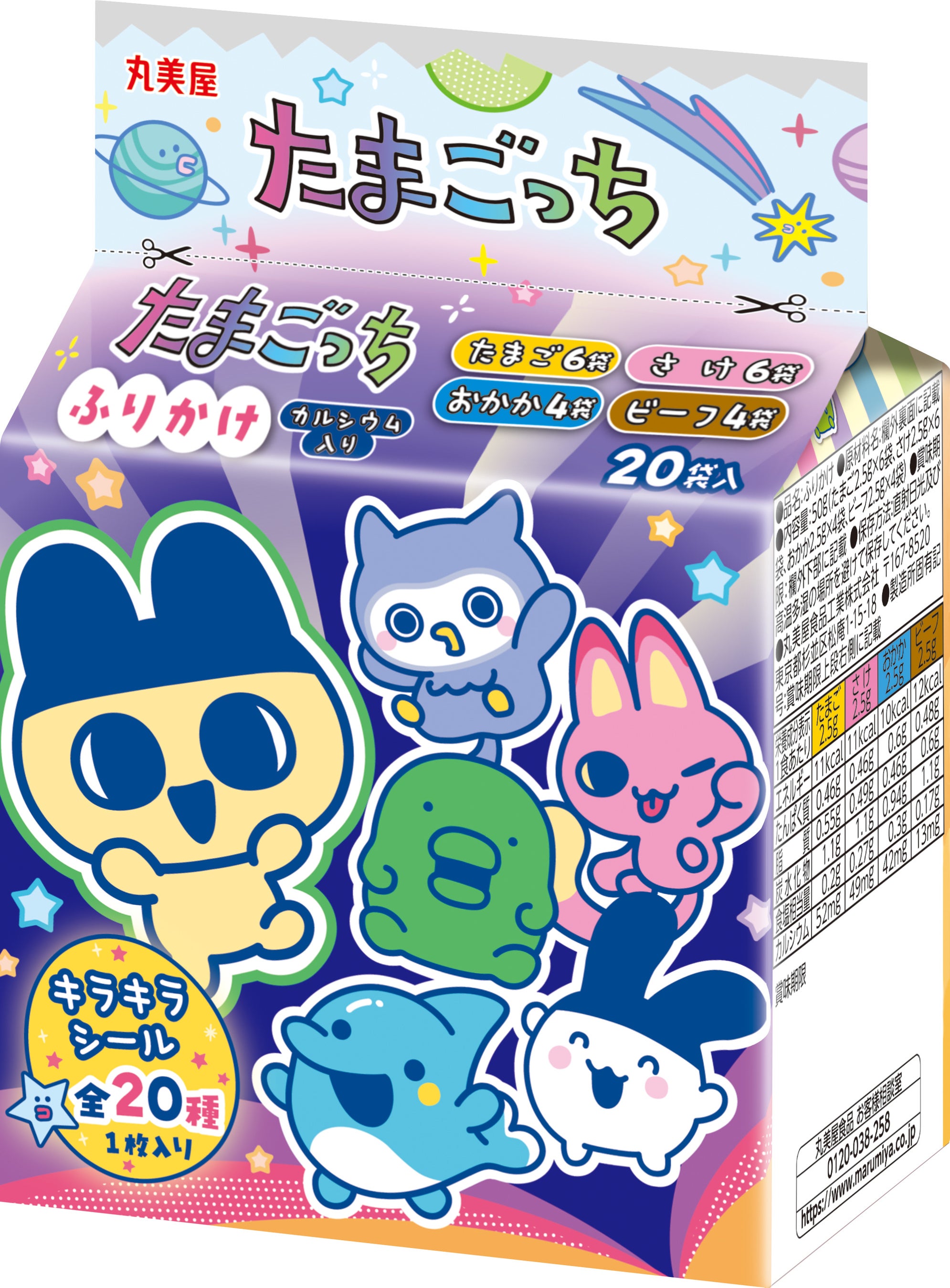 2品共通の丸美屋オリジナル「たまごっち キラキラシール」1枚入り(全20種)です。