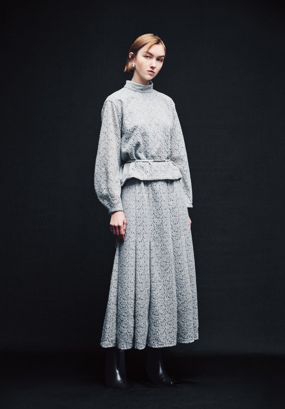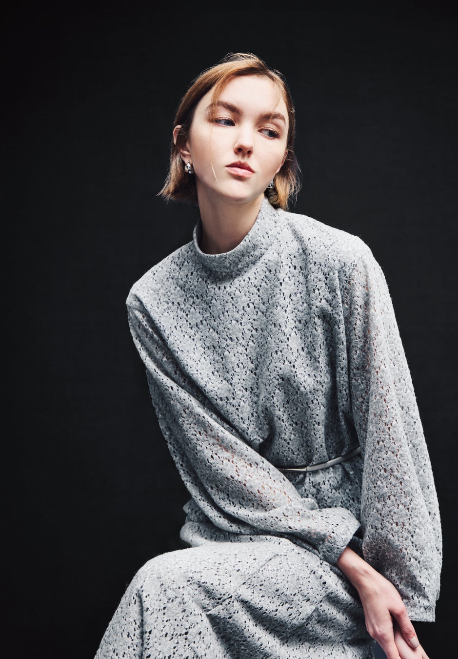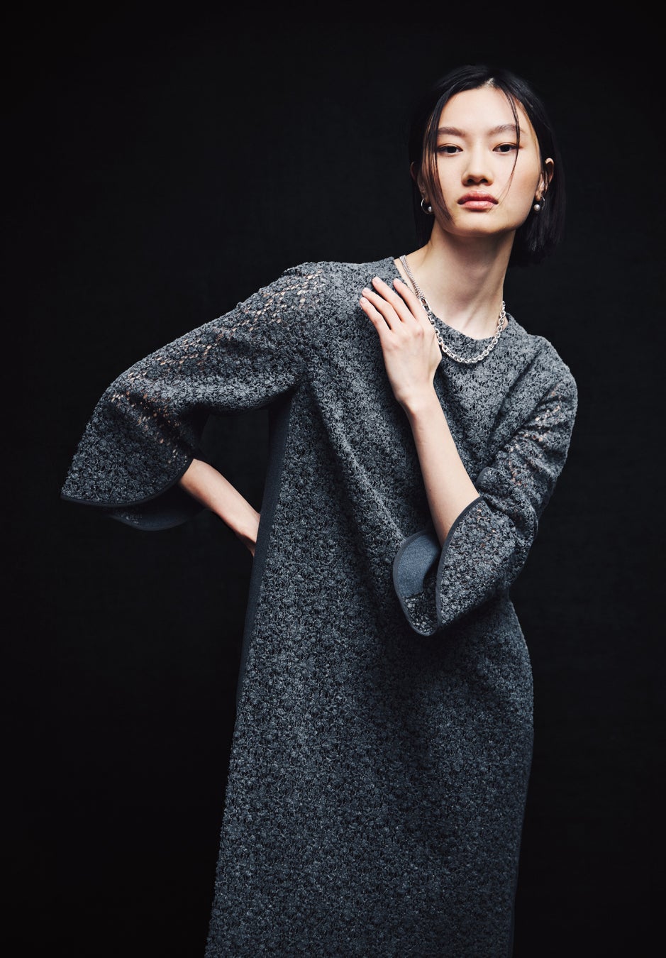 全体的に重くなりがちな冬のコーディネートを新鮮にアレンジできるアイテムを作りたいと考え、華やかで、軽やかで、温もりのある風合いに仕上げたブランドオリジナルのウールレースを使い、ドレス、プルオーバー、スカートの3アイテムを作りました。