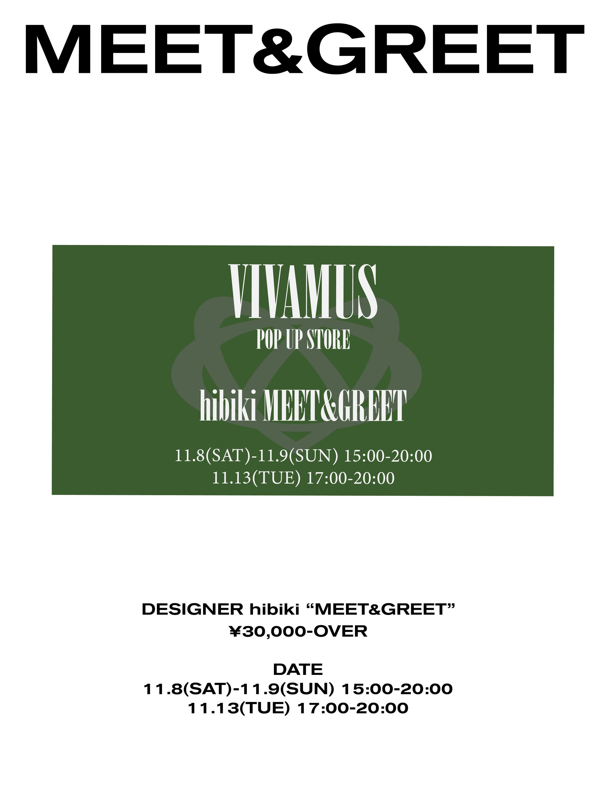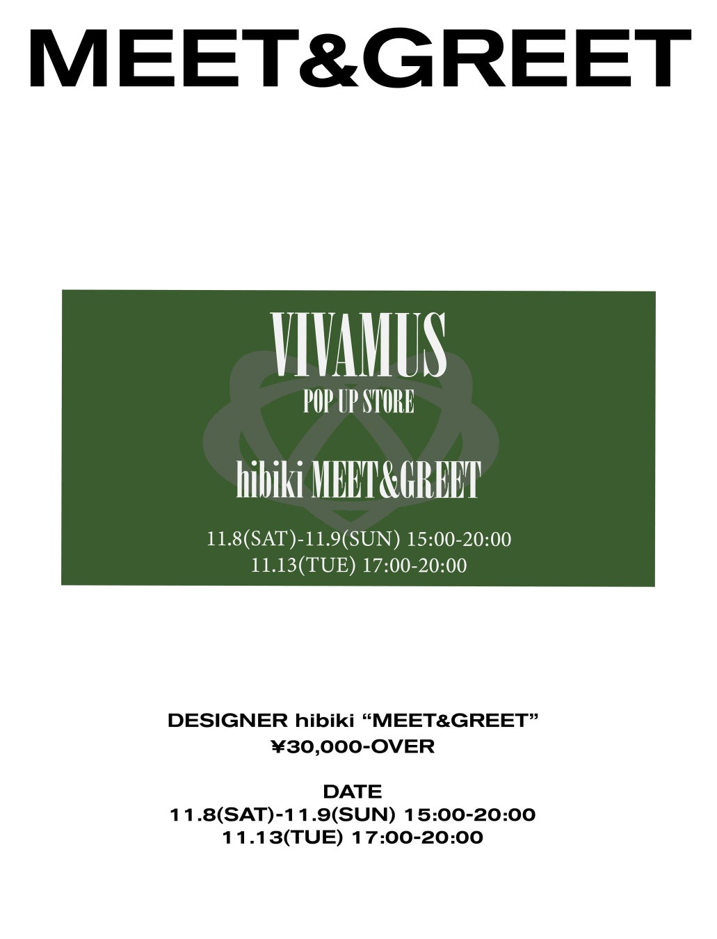 POP UP開催を記念して、「VIVAMUS」の商品を税込¥30,000以上お買い上げいただいたお客様は、以下の日程でディレクター「hibiki」と写真撮影できる特典もご用意しております。