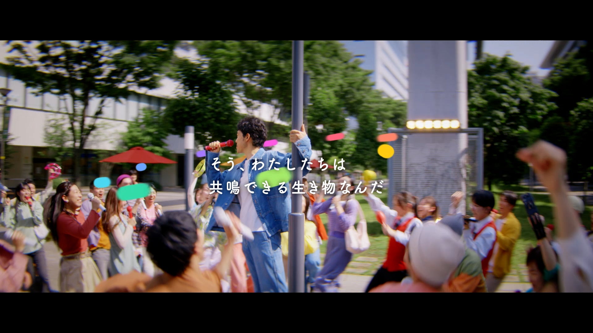歌を口ずさみながらご機嫌に街を歩く大泉洋。すると、次第に周りに人が集まってきます。大泉洋が手を高らかに上げると、そこにはいつの間にかマイクが。軽快な歌とステップに合わせて、道行く人もマイクやマラカスを握り、街全体が巨大なカラオケステージさながらに盛り上がります。
