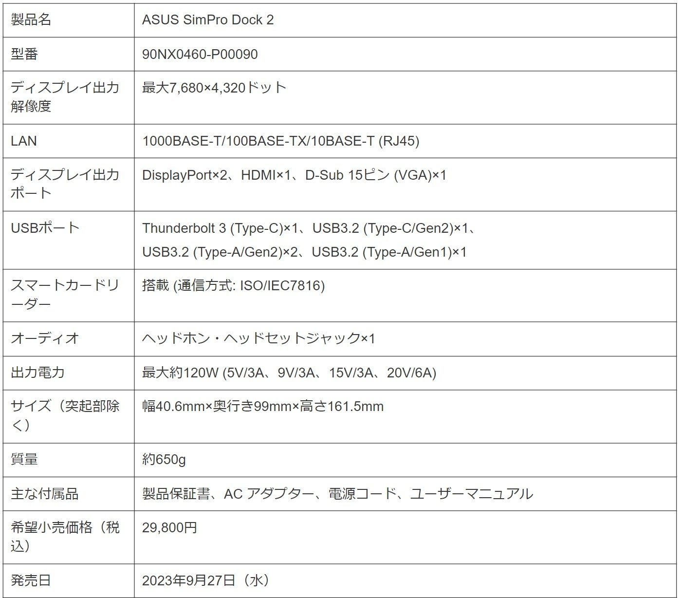 ISO/IEC7816規格準拠接触型カードリーダー搭載のマルチな拡張性を提供するドッキングステーション「ASUS SimPro Dock 2」を発表。